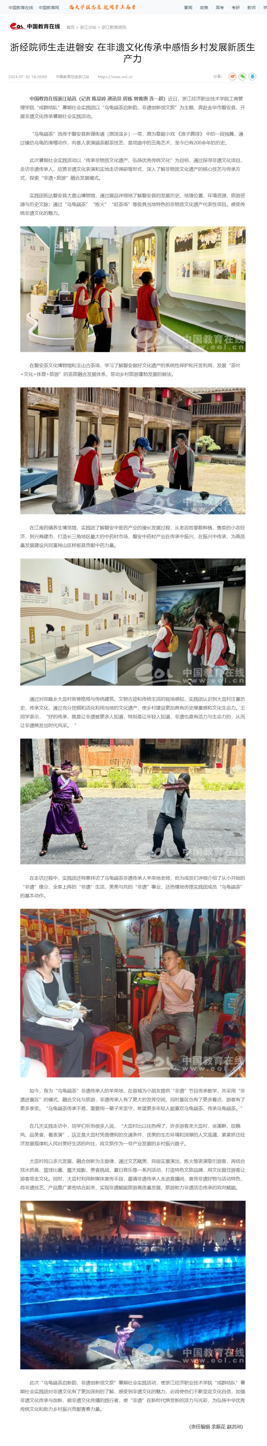 【中国教育在线】浙经院师生走进磐安 在非遗文化传承中感悟乡村发展新质生产力 近日,《中国教育在线》报道工商管理学院“成群结队”暑期社会实践团以“乌龟端茶启新韵,非遗创新领文旅”为主题,奔赴金华市磐安县,开展非遗文化传承暑期社会实践活动,通过探寻非遗文化项目、走访非遗传承人、欣赏非遗文化表演和实地走访调研等形式,深入了解非物质文化遗产的核心技艺与传承方式,探索“非遗+旅游”融...