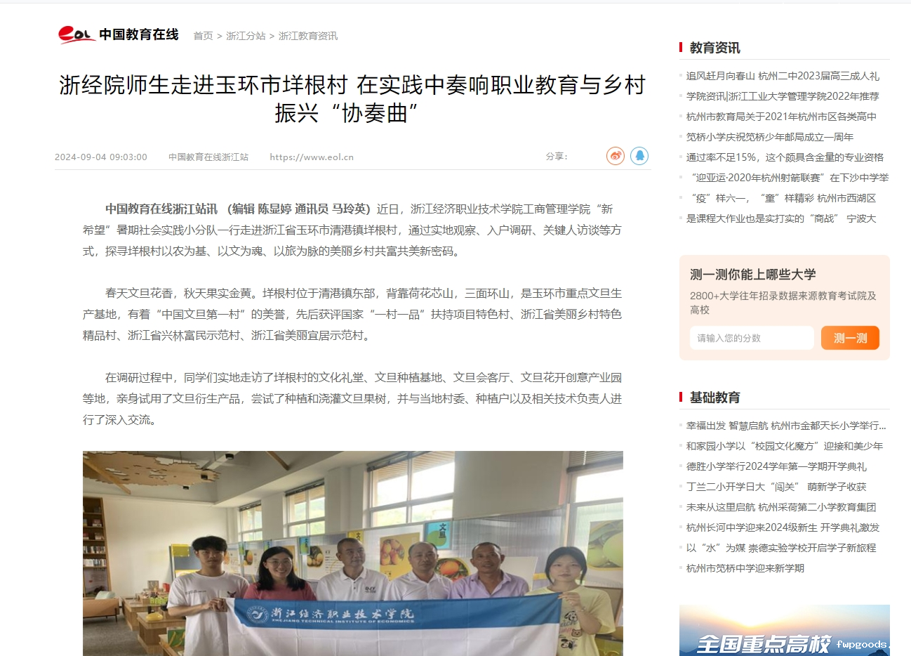 【中国教育在线】浙经院师生走进玉环市垟根村 在实践中奏响职业教育与乡村振兴“协奏曲” 近日,《中国教育在线》报道我校工商管理学院“新希望”暑期社会实践小分队一行走进浙江省玉环市清港镇垟根村,通过实地观察、入户调研、关键人访谈等方式,探寻垟根村以农为基、以文为魂、以旅为脉的美丽乡村共富共美新密码。媒体链接:https://zhejiang.eol.cn/zhejiang_news/202409/t20240904_2631055.shtml编辑:房栋
