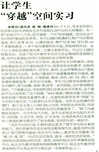 『媒体关注』《浙江日报》对我校教育信息化工作的报道 2011年10月1日的《浙江日报》在人文版以《虚拟课堂真实训》为题,对我校虚拟仿真实训平台等教育信息化建设情况给予报道,详情点击:http://zjdaily.zjol.com.cn/html/2011-10/01/content_1117170.htm?div=-1