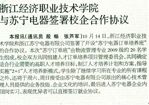 『媒体关注』 《教育信息报》对我校与苏宁电器校企合作的报道 2011年10月25日,《教育信息报》在第三版以《华体汇app全站版与苏宁电器签署校企合作协议》为题报道了我校与苏宁合作开设“苏宁电器订单培养班”的相关事宜,敬请留意。