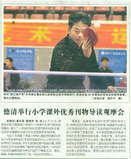 『媒体关注』高校校长乒乓球比赛 12月11日,我校承办2010年第二届高校校长“浙江物产杯”乒乓球比赛,社会媒体给予了关注和报道。1、《教育信息报》2010年12月14日(周二),第一版。2、《杭州日报》2010年12月16日(周四),A15版。http://hzdaily.hangzhou.com.cn/hzrb/html/2010-12/16/content_987065.htm