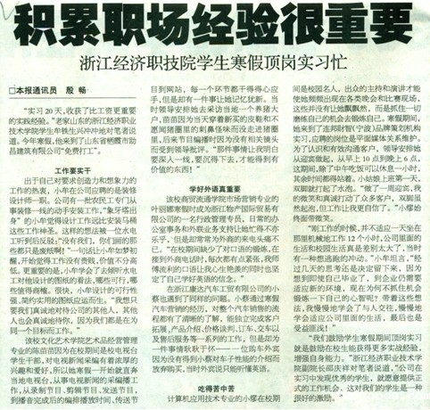 『媒体关注』《教育信息报》对我校学生寒假顶岗实习事迹的报道 2011年2月22日的《教育信息报》在招考就业版以《积累职场经验很重要——华体汇app全站版学生寒假顶岗实习忙》为题报道介绍了我校学生在寒假中积极投身社会实践的情况,敬请关注。