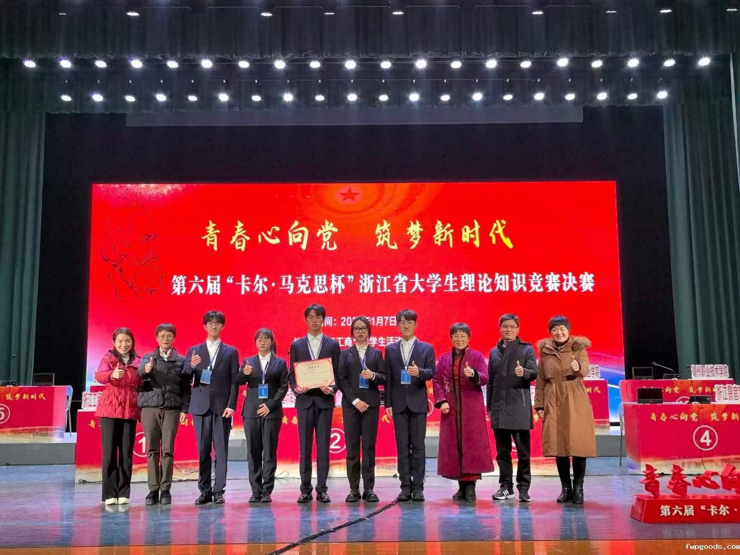 喜报︱再创辉煌!我校在第六届“卡尔·马克思杯”浙江省大学生理论知识竞赛上荣获一等奖 1月7日,第六届“卡尔·马克思杯”浙江省大学生理论知识竞赛决赛在浙江工商大学举行。经现场激烈角逐,由许垌薇(商贸流通学院)、李吉达(物流与供应链管理学院)、周轶群(财会金融学院)、陈宇航(商贸流通学院)、林飞成(数字信息技术学院)五位同学组成的我校代表队在决赛中力压群雄、脱颖而出,斩获一等奖。马克思主...