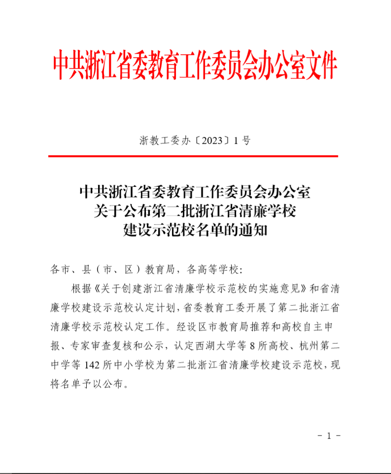喜报 | 我校被认定为第二批浙江省清廉学校建设示范校 2023年4月8日,中共浙江省委教育工作委员会办公室公布了第二批浙江省清廉学校建设示范校名单,我校成功入选。 近年来,学校党委坚持以习近平新时代中国特色社会主义思想为指导,深入贯彻落实省委、省委教育工委纵深推进清廉浙江、清廉学校建设的部署要求,坚持以政治建设为统领、以组织建设为基础、以思想建设为根本、以纪...