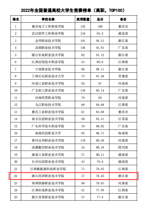历史性突破!我校在2022年全国普通高校大学生竞赛榜单(高职,TOP100)位列第22名 近日,中国高等教育学会高校竞赛评估与管理体系研究专家工作组发布《2022全国普通高校大学生竞赛分析报告》。我校在2022年全国普通高校大学生竞赛榜单(高职,TOP100)位列全国第22名,浙江省第4名,排位创历史性突破! 此外,在全国普通高校大学生竞赛七轮总榜单(高职,TOP300)排名第69名(较前六轮排名前进11个位次)...