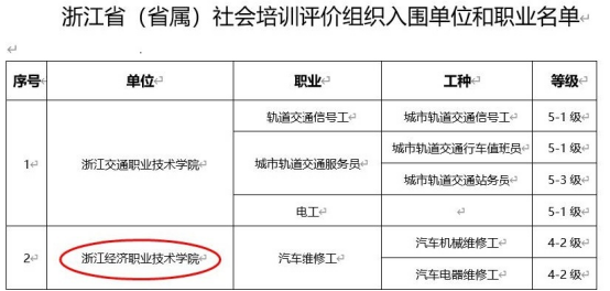 我校成功入围浙江省(省属)首批社会培训评价组织 2022年1月14日,经过主动申报、资格审查、现场评估、集中路演等环节,我校成功入围浙江省(省属)首批社会培训评价组织,并将面向全省开展汽车维修工(汽车机械维修工、汽车电器维修工)职业技能等级认定工作。 据悉,社会培训评价组织是以人才培养服务为主要工作职责,经国家人社部门遴选确定,在备案的职业(工种)范...