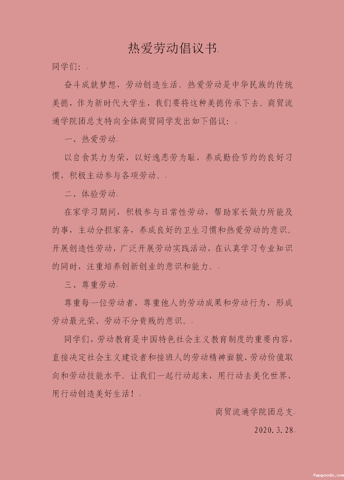 党建直通车∣商贸党建带团建 居家抗“疫”劳动教育正当时 3月28日,商贸流通学院团总支在团员青年中发出了《热爱劳动倡议书》,号召分院全体同学热爱劳动、体验劳动、尊重劳动。 近日,中共中央、国务院印发《关于全面加强新时代大中小学劳动教育的意见》,要求把劳动教育纳入人才培养全过程。商贸流通学院党总支充分认识到,在当下学生居家学习的场域,正是开展劳动教育的绝佳时...