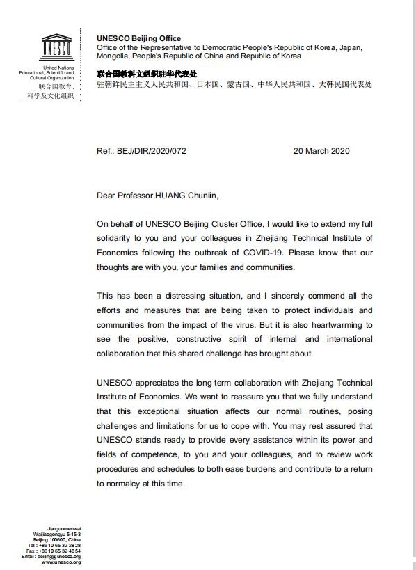 联合国教科文组织驻华代表处致信慰问我校 3月20日,联合国教科文组织驻华代表处主任欧敏行(Marielza Oliveira)给我校发来慰问信,表达了对学校全体员工的支持和问候。她表示联合国教科文组织驻华代表处真诚感谢与我校长期以来的合作,并将与我们同舟共济、共克时艰。 联合国教科文组织驻华代表处(UNESCO Beijing Office)负责教科文组织在中国、朝鲜、日本、蒙古国...