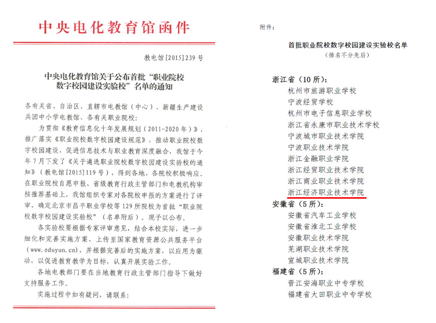 喜报:我校被确定为首批职业院校数字校园建设实验校 日前,中央电化教育馆下发教电馆[2015]239号文件《中央电化教育馆关于公布首批“职业院校数字校园建设实验校”名单的通知》,我校正式被批准为首批职业院校数字校园建设实验校,这是我校自2012年11月被教育部确认为“第一批教育信息化试点单位”之后,对我校教育信息化工作的再次肯定。我校是浙江省唯一一所同时被批准...