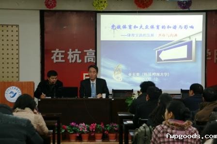 韩国体育哲学学会会长金东奎教授来我院讲学 2008年12月23日,应东亚地区国际学校体育协会中方组委会的邀请,韩国体育哲学学会会长金东奎教授在我院作《竞技体育和大众体育的和谐与影响——体育实践的发展:共存与沟通》的专题学术报告。上海交通大学体育系书记徐宝庆教授、同济大学体育部主任施斌教授、浙江工商大学姜丽教授及来自在杭十余所高校的体育部(室)主任和骨...