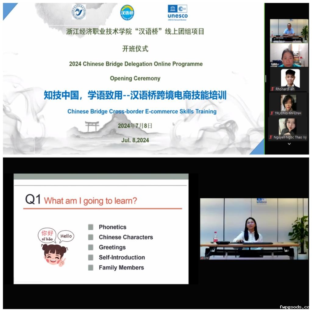 2024“汉语桥”:知技中国,学语致用——跨境电商技能培训项目在我校启动 为满足“一带一路”沿线国家青年学生及社会学习者学习中文、增长技能的需求,由教育部中外语言交流合作中心主办,我校承办的2024“汉语桥”:知技中国,学语致用——跨境电商技能培训项目于2024年7月8日正式启动。来自越南、菲律宾和马来西亚等国家近300名学员参加了该项目的学习。针对东盟国家青年学生及社会学习者学习特点...