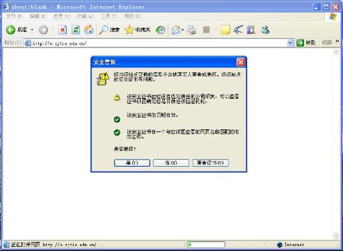 关于数字化校园门户登陆的说明 由于采用了HTTPS的安全加密协议和CA的统一身份认证技术,各位老师和学生在输入http://e.zjtie.edu.cn 时,会根据您电脑浏览器不同有所不同,常用浏览器为微软的IE6和IE7情况如下:[1] IE6.0会出现下图所示请大家点“是”。[2] IE7.0会出现下图所示请大家点“继续浏览此网站(不推荐)”。