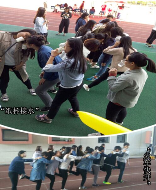 第二项团体赛是由“火车快开”和“纸杯传水”两个小项目组成。在每个项目中,各组队员团结一致,竞技中不失和谐,赛场上不失友谊。成员通过相互的协作,加深友谊,释放压力。操场上加油声、喝彩声让活动气氛一次次达到高潮。