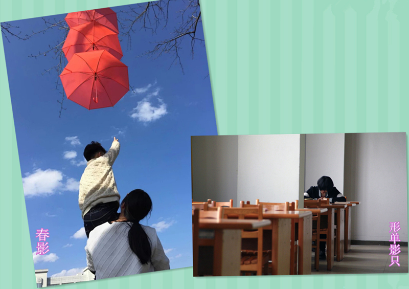 一些选手的作品还反映了对生活的观察和思考,如李双双拍摄的《形单影只》,偌大的一层图书馆只有一位同学在看书,呼吁同学们多多走进图书馆;郑鉴瑶拍摄的《春影》,照片的主角是她的姐姐和外甥,碧蓝的天空、红色的雨伞、白色的两个任务背影形成鲜明的对比,坐在姐姐肩上的孩子象征着不断向上延续的传承,姐姐的目光承载了一个母亲所殷切寄托的希望。
