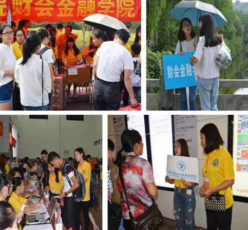 在学校拥挤的人群中攒动着财会金融学院志愿者的点点金黄,像九月的桂花,点缀在人群中,形成了一道靓丽的风景线。每一个环节都有他们的身影:报到注册、领热水卡,饭卡,军训服装,提行李……。而“财会金融学院校友迎新队”是志愿者中最为夺目的一支。“作为一名已经工作的财金‘老人’,来母校看看学弟学妹,看看小鲜肉,再听听老师们的唠叨,很幸福。”一名2012届校友志愿者笑着说道。虽然今天没有明媚的阳光,但是分院志愿者这道金黄却为这个阴天增添了一份暖色调。
