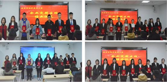 2019年11月26 日下午三点半,财会金融学院在信息楼证券投资实训室举办了第二届企业定制班结业典礼,出席本次结业典礼的有财会金融学院院长王茜、党总支副书记康粟丰、副院长崔玉江、会计专业室主任朱丹、投融资专业室主任吴庆念以及第二届企业定制班全体学员。郭橙老师担任本次典礼的主持人。