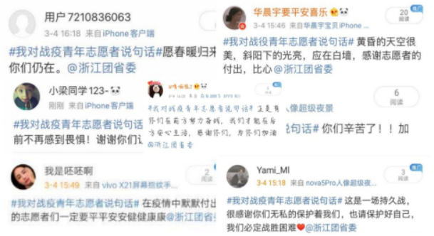 虽然素未谋面,却足以铭记一生,财金学子们将自己心底的敬佩和感谢之情通过文字传递出去。“知道你们流了无数的汗水,流了无数的泪水,但在祖国患难当头,是你们的默默付出,为春天的到来贡献出力量。我相信,总有一天,你们的脸上也会充满笑容,加油勇士们,正因为有你们,我们都会好好的。”“加油!你们是最棒的!让我们一起对抗病毒,期待胜利到来的那一天!”大家纷纷用自己的表达方式致敬抗击在疫情前线的战士们,感恩坚守在各自岗位上的工作人员们,也为同心战斗的志愿者们加油打气。他们在重大疫情和困难面前不计得失、甘于奉献、勇挑重担的责任意识和大爱精神令人动容!