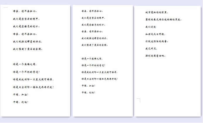 “……尔后/我听到了国的号召打破沉寂/我看到了战士披甲五军齐战/我感受到了/华夏儿女共同筑起的战疫防线。……中国,加油/中国,别怕!”短短280字,是大家战胜困难的信心,是凝聚的爱国之情,也是砥砺奋进的强国之志。