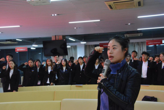 紧接着,在应越老师的带领下,新一届学生干部们右手握拳举于肩上,用洪亮有力的宣誓声表达出自己的决心与信心。宣誓完毕后,康粟丰老师向新一届干部致辞。康老师主要从作为学生干部应当具有的大局意识、服务意识和底线意识三方面展开,要求大家在工作、学习、生活的方方面面都要明确自己所担负的责任和使命,“火车跑得快,全靠车头带,希望大家形成一股合力,将财会金融学院这辆火车带得又快又稳。”这不仅是老师对于各位新一届学生干部的期望,也是对学生干部职责的最好诠释。