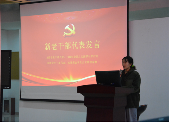大会伊始,全场起立,奏唱国歌。接着,由2018级团总支副书记张欣月和2019级学生会主席项春静分别代表新老学生干部上台发言。张欣月在发言中饱含了感谢之情和期望之意,项春静在发言的最后说到:“我们所有的学生干部拧在一起便是闪电,聚在一起就是太阳!”这是对学生干部们团结奋进、荣辱与共的奋斗精神和责任意识的号召和勉励。