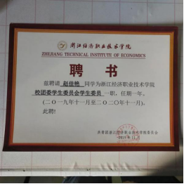 浙经院2018-2019学年“年度优秀学生干事”荣誉称号