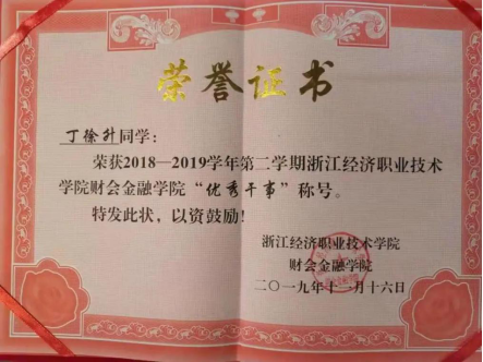在工作上,她踏实、负责、勤恳。担任班级文体委员和分院新闻中心副主席,认真负责老师交付的各项事务,组织班级同学参加活动,安排部门干事活动开展,被评为2018—2019学年学校“优秀班委”和财会金融学院“优秀干事”。