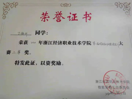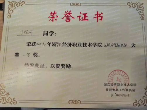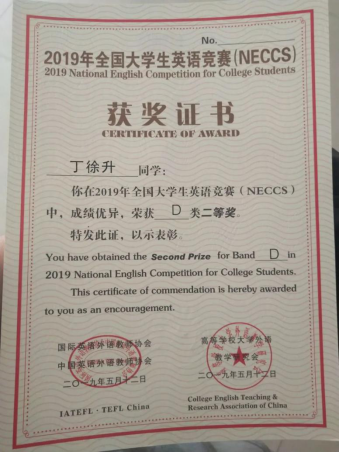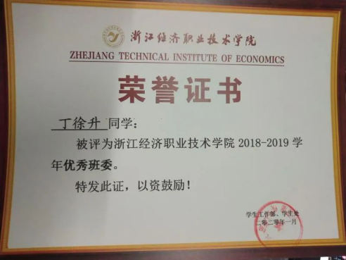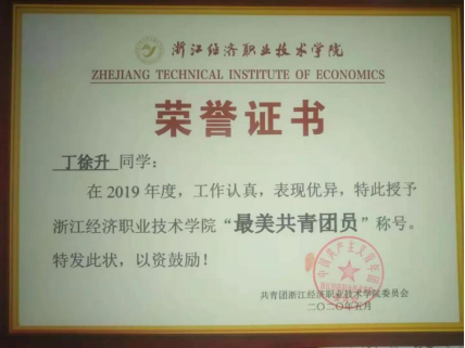 在工作上,丁徐升同学认真刻苦。上学年学习成绩位列班级第一,综合考评排名第六。荣获国家奖学金同时被评为年度“三好学生”。