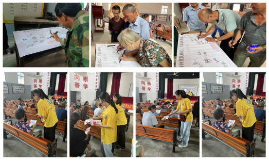 当天上午,实践小组在上陈村文化礼堂向各位村民发放了知邪防邪反邪的反邪教宣传单,小组成员结合生动的图片和案例,以接力的形式通过视频展示和宣讲开展了反邪教宣传,让大家擦亮眼睛,防止上当受骗,呼吁村民们崇尚科学,抵制邪教,共同提高反邪意识。宣传结束后,小组成员同村民们一起响应倡议,在“青春向党践初心,共筑反邪新防线”主题签名海报上郑重写下自己的名字。