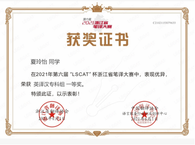 1.2021年6月,获得第六届“LSCAT‘杯浙江省笔译大赛英译汉专科组一等奖。