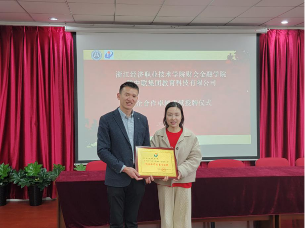 双方在研讨后,还进行了授牌仪式。基于财会金融学院在与中联集团校企合作方面的突出表现,中联集团教育科技有限公司授予我们学校2021年度中联集团“金翼匠心奖”暨“校企合作杰出贡献奖”,并授予王茜教授为智能财经专业委员会数字财税研究平台专家。