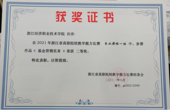 课程教学过程中,她始终不忘金融行业诚信守法、敬业专注的职业要求,努力将社会主义核心价值观教育贯穿课堂教学各个环节。每学期通过课后线上视频的形式与每班学生进行产品知识口头演练的时间达10小时以上,以身体力行践行“敬业”精神,其主讲的《金融产品营销岗位实训》的银行模块课程成功申报国家级精品课程和国家级精品资源共享课程,本人作为《基金营销实务》的团队核心成员在“2021年浙江省高职院校教学能力比赛”中获得二等奖。
