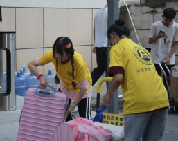 玉屏洲生活区的财金志愿者们拉着小推车,已经准备好为学弟学妹们带路指引、搬运行李。“滴”,面部识别成功,新生们成功进入宿舍,整理行囊,安顿休息,熟悉环境,为迎接崭新的校园生活做准备。