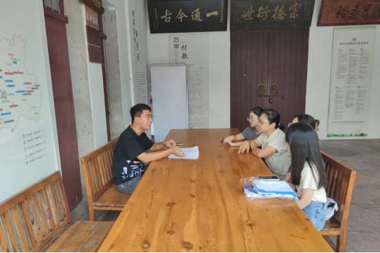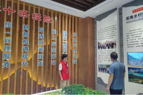 随后,队员们来到了后岸经验馆,在后岸村体育委员陈海军的讲解下,同学们对后岸村的乡村振兴建设有了更加详细的了解。正逢周日,游客来往络绎不绝,见陈大伯一个人接待游客分身乏术,同学们便提议开展展馆讲解志愿服务。戴上“小蜜蜂”,同学们当起了讲解员,得到了村委和游客们的点赞。讲解词中的内容“后岸村坚持党建引领,践行‘两山’理论,首创统分结合、公私共赢的‘四统一’管理模式,形成‘生态文明+共同富裕’的后岸经验。”深刻阐述了后岸村从1.0到2.0版本转型的摸索过程,让我们感受到了基层党员默默努力,向着更高质量、更富活力的共同富裕新图景一步步扎实推进。