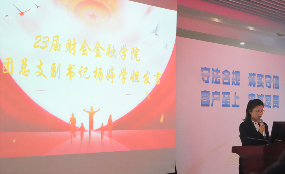 接着2021级学生干部代表、2023届财会金融学院团总支副书记杨婷学姐发言,她的精彩发言字里行间显示了她对工作的认真负责,对整个团队的真挚热爱,对学院的无私奉献和依依不舍。