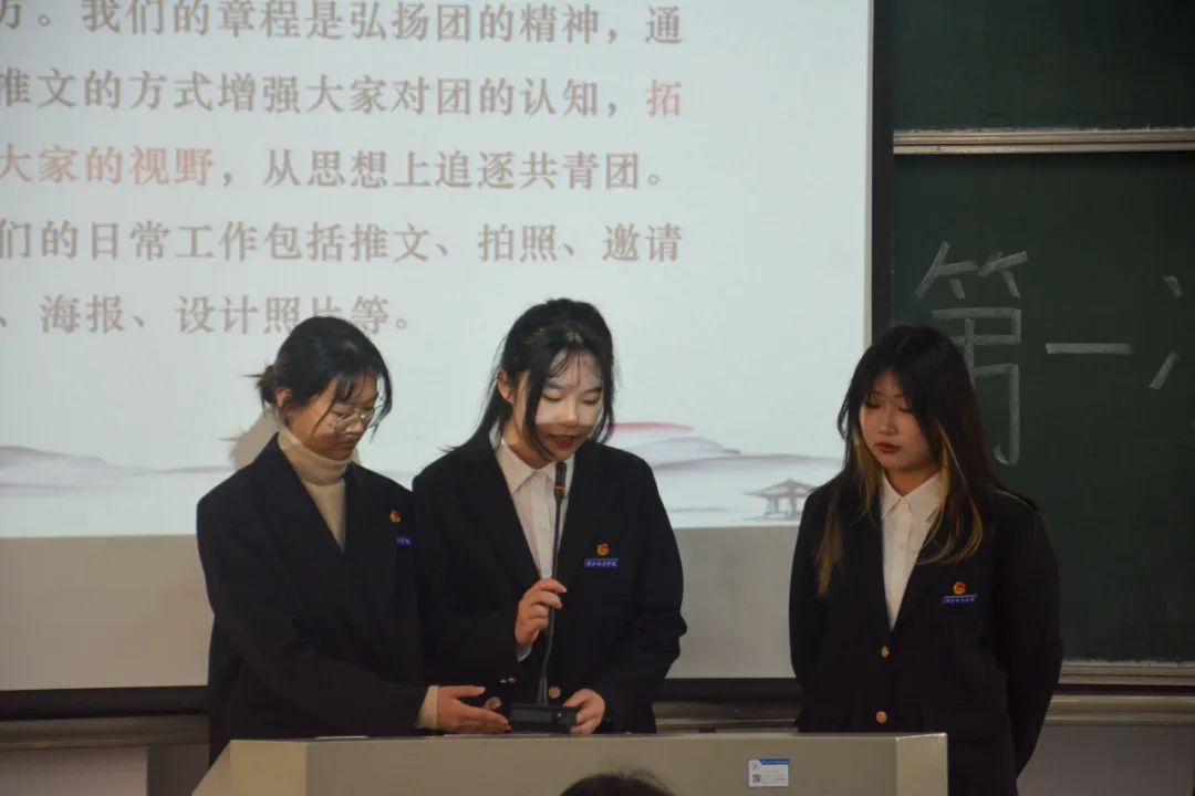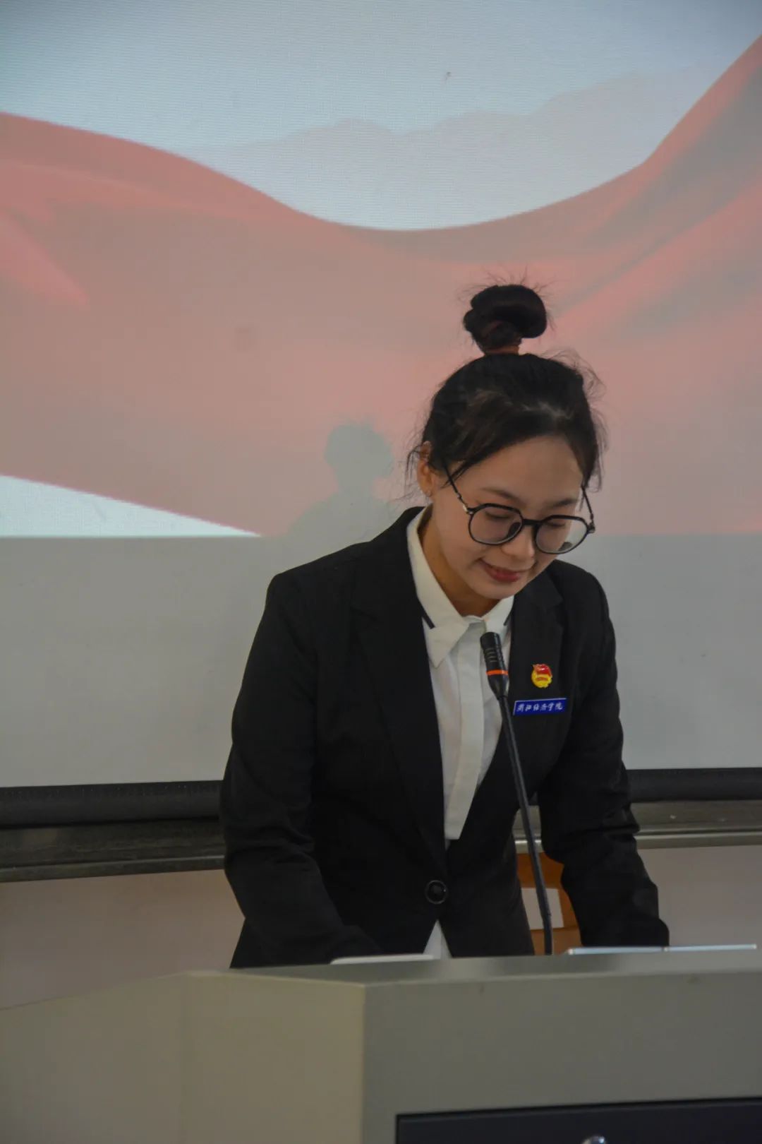 24届财会团总支副书记徐鑫媛上台发言,徐鑫媛同学说道:“要有团队意识,不管是部门之间要多加强沟通,培养团队协作能力。要有责任感,明确自身职责,作为团总支的一员要时刻牢记大家是为学院服务,为老师服务,为同学们服务。要与时俱进,学会创新,吸收好的工作方法,广泛听取和采纳师生的意见和建议,创新自己的工作模式。”