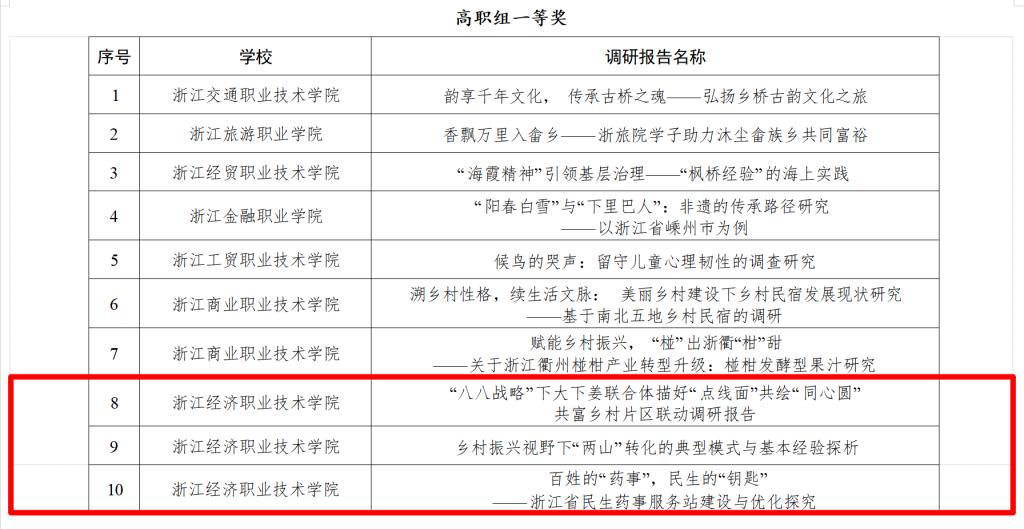 1月25-26日,由中共浙江省委宣传部、浙江省文明办、浙江省教育厅、共青团浙江省委、浙江省关爱下一代工作委员会、浙江省学生联合会联合主办的2023年浙江省高校暑期社会实践优秀调研报告评选决赛在宁波大学落下帷幕。全省共有94所高校限额推报606份调研报告进入初赛,经过书面评审,共有141份调研报告入围决赛。我院由杨桂苓、王嘉佳老师指导的百姓的“药事”,民生的“钥匙”——浙江省民生药事服务站建设与优化探究项目(团队成员:胡诗怡、余艳楠、竺莉芳、杨蕾、周懂阳)荣获一等奖。