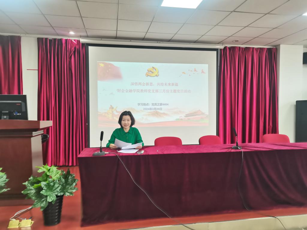 3月全国两会在北京召开,为深入学习贯彻党的最新方针政策,加强对两会精神的理解和把握,了解国家的发展方向和政策措施,提高党员教师的政治素质和业务能力,引导教师党员将两会精神落实到教育教学的实际工作中,不断提高教学质量和育人水平,共同分享学习心得和工作经验,财会金融学院学院教师党支部开展“深悟两会新思,共绘未来新篇”的3月份主题党日活动。
