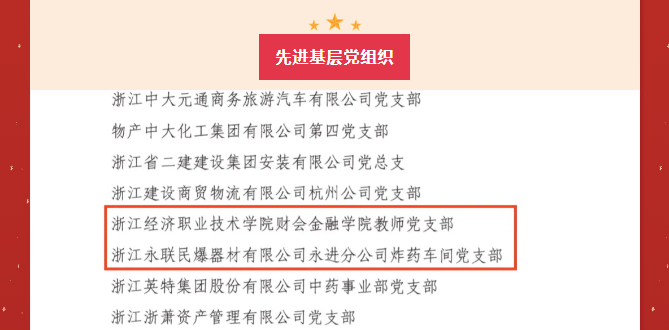 本次浙江省国资委党委评选省国有企业“两优一先”活动中,共评选表彰省国有企业“先进基层党组织”8个,浙经院财会金融学院教师党支部、永联公司永进分公司炸药车间党支部作为省机电集团公司下属成员单位基层党支部,共同获此荣誉。