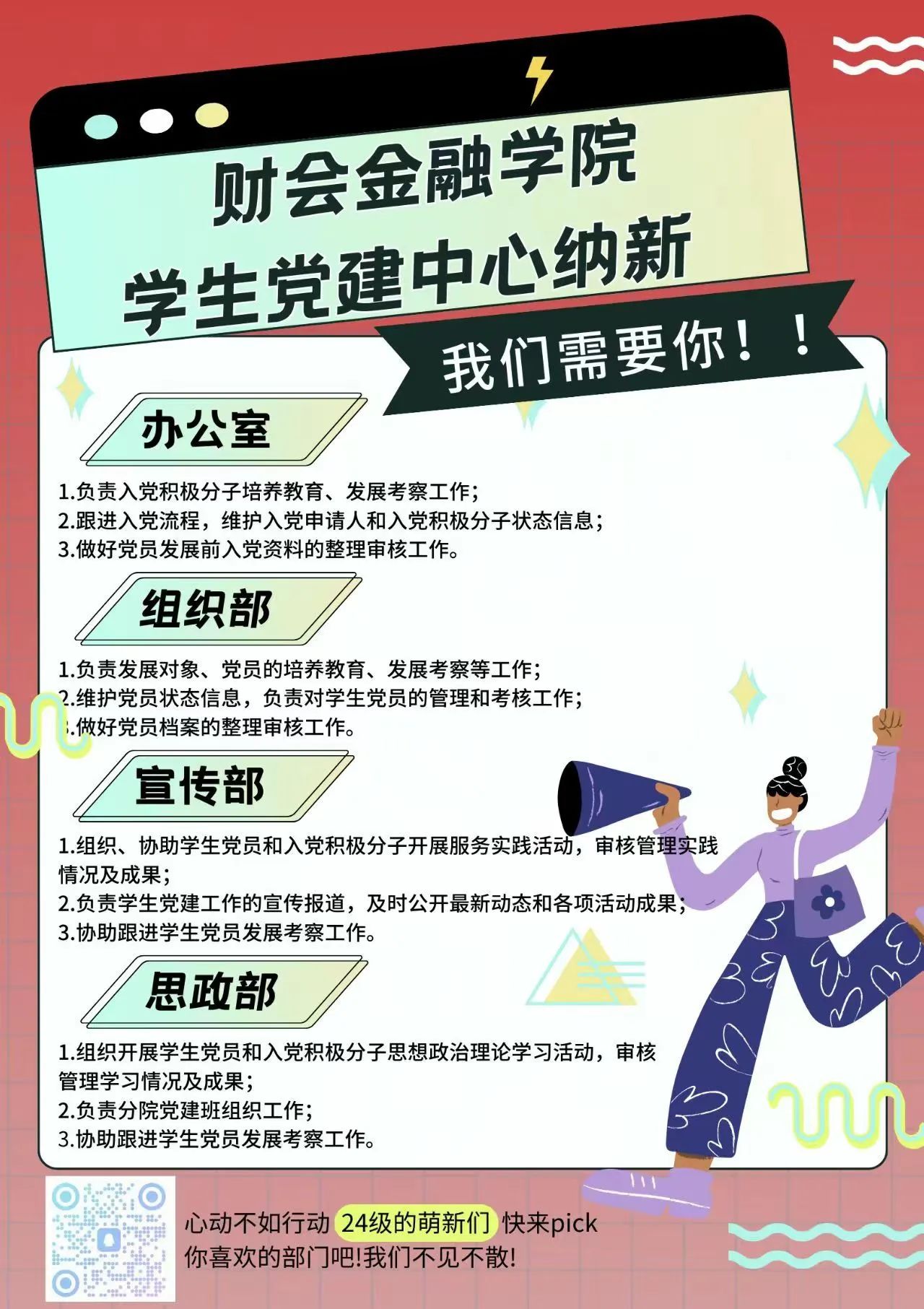 在这个充满希望与挑战的新学期,我们财会学院七大组织携手开启了一场盛大的招新盛宴。这里,不仅是知识的海洋,更是梦想起航的港湾。我们诚挚地邀请每一位热爱财会、渴望成长的学子,加入我们的行列,共同书写青春的华章,开启一段全新的旅程!