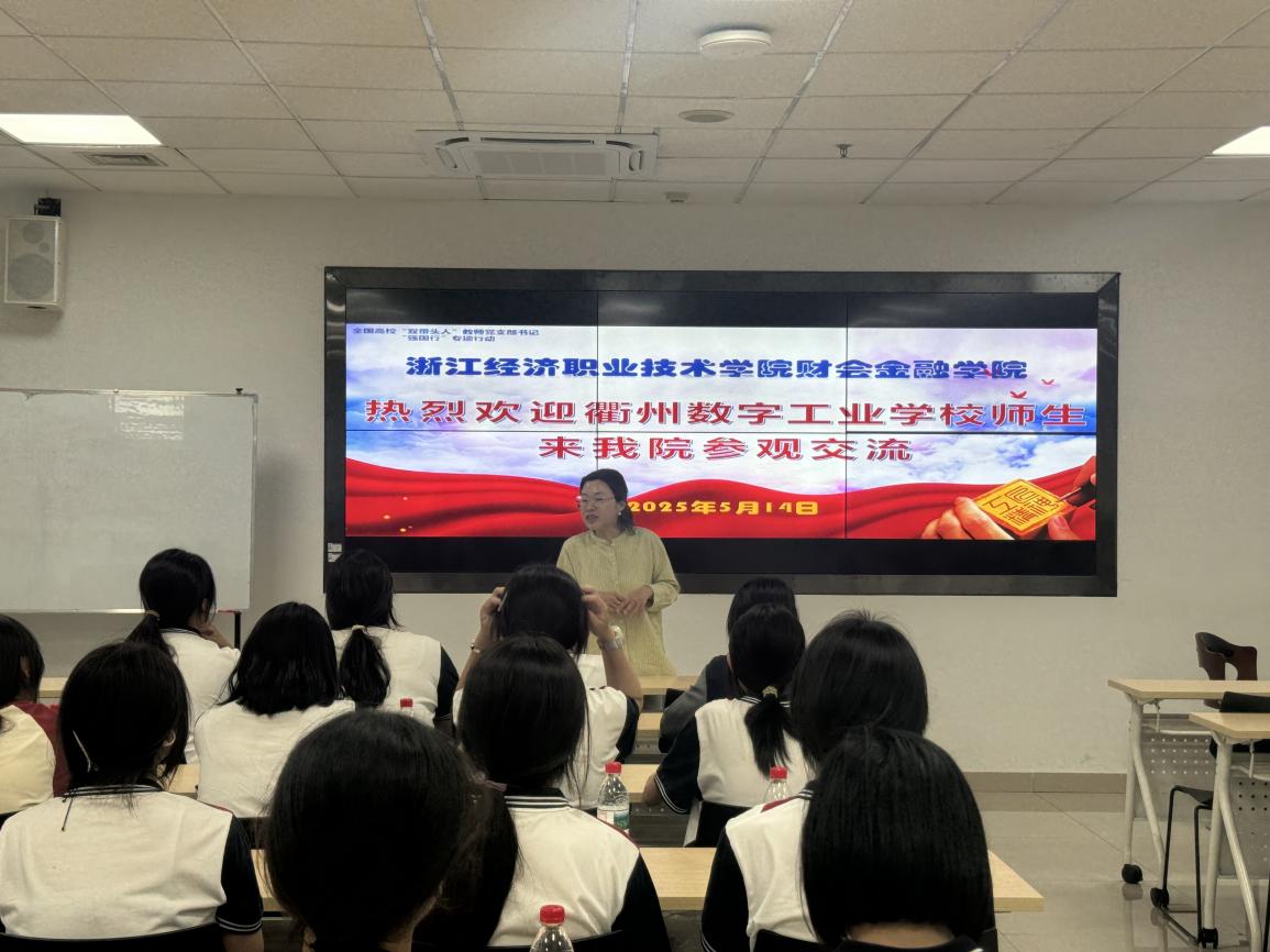 5月14日中午,浙江省衢州数字工业学校副校长吴志成率师生一行 44 人走进我校,开展探校研学活动。此次活动以增强学习内驱力,助力中高职一体化发展为目标,通过沉浸式参观、专业实训观摩、前沿知识讲座等多元形式,为中高职教育协同发展搭建起互通桥梁,同时也为中高职一体班级学生点燃了学习热情,为提升师生大数据与财务管理专业素养开辟了新路径。