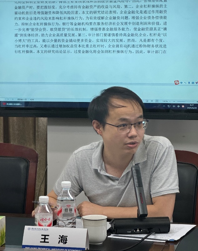 研讨会上,四位教师围绕数字经济领域的前沿课题展开分享:单松老师作《非金融企业金融化:杠杆缓冲器还是操纵催化器》主题报告,王婕佳老师分享《经济增长视角下中国对发展中国家的OFDI研究》,张亚男老师探讨《台知识治理与新服务开发绩效:隐性知识共享和价值共创的链式中介作用》,余茜茜老师汇报《数智时代内控韧性与企业绩效:风险管理效率的中介作用》。