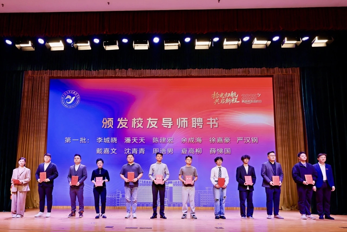 在本次学校校友返校欢迎大会上,数字财经学院校友会会长沈海俊参加校友企业产教融合签约仪式,沈青青、戴嘉文、周浩男三位优秀校友被评为校友导师。未来,他们将一如既往心系母校,与母校携手同行,共启新程!