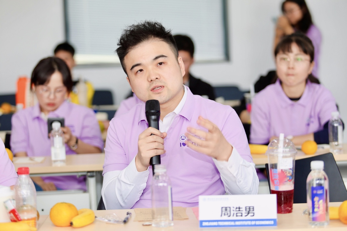 本次活动的重头戏——校友座谈会环节特邀五位杰出校友分享成长经验。2013级数字财经学院校友分会副会长、浙江极氪智能科技有限公司财务核算经理方秋红分享了财务核算方面的经验与技巧;1996级浙江原爱贸易有限公司总经理周胜亚分享了他的职场经历和心路历程;2003级浙江求德律师事务所律师沈青青以从校园到法庭的跨越为主题,讲述了法律人的职业坚守;2012级浙江高诚融资担保有限公司副总经理戴嘉文分享了金融路上的坚持与突破;2012级创市(苏州)私募基金管理有限公司总经理周浩男则畅谈投资视野下的职业规划。现场互动环节气氛热烈,在校生踊跃提问,校友专业细致的解答赢得阵阵掌声。