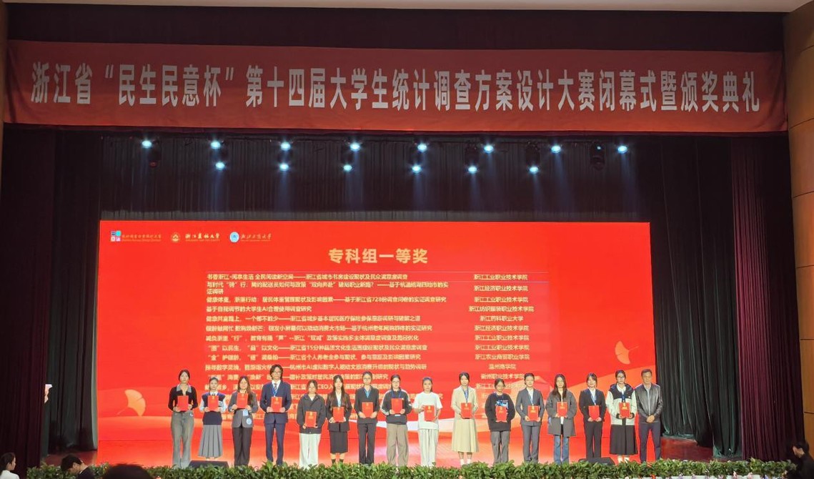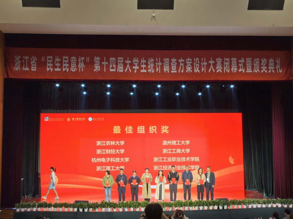 11月7日-8日,浙江省“民生民意杯”第十四届大学生统计调查方案设计大赛在浙江农林大学圆满落下帷幕。经过激烈角逐,我校数字财经学院杨桂苓、王嘉佳、章学萍指导的2支参赛队伍发挥出色,获得两个一等奖。这是我校连续六年在该项赛事中获得一等奖的佳绩,充分展示了我校学生在统计调查与数据分析领域的强大实力。学校获得优秀组织奖。