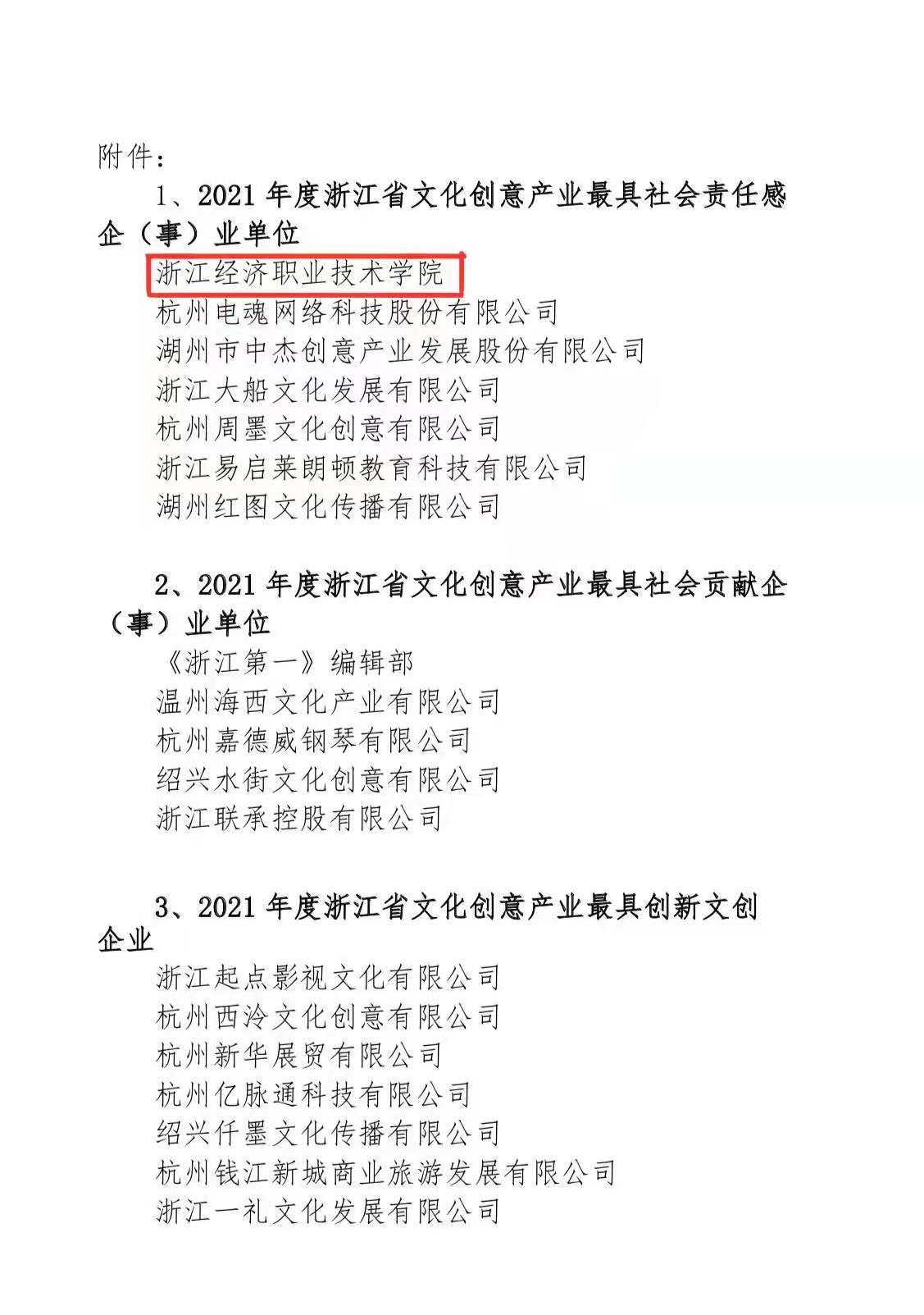 近日,浙江省文化创意产业协会公布了年度浙江省文化创意产业获奖优秀单位名单,我校再次荣获2021 年度浙江省文化创意产业最具社会责任感企(事)业奖。