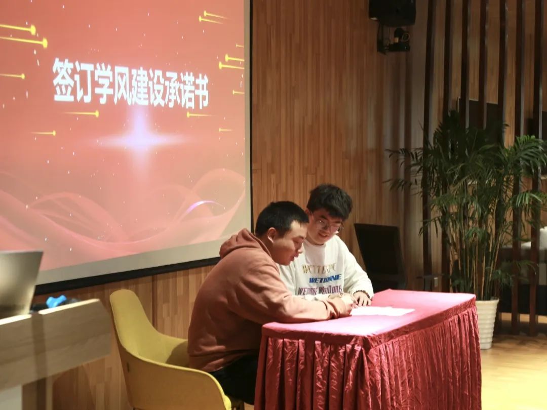 各班班长、学习委员及学院学生组织干部上台签订班级学风建设承诺书。