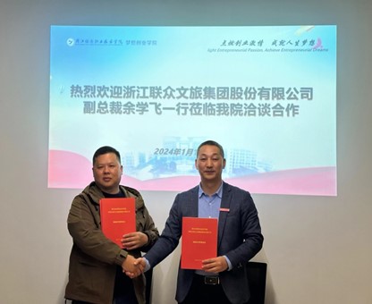 1月18日下午,我校与浙江联众文旅集团股份有限公司战略合作协议签订仪式在梦想创业学院举行。联众文旅集团副总裁余学飞,大健康事业部总经理贺永辉,战略发展部总经理杨小歌,总裁助理张凯蒙等企业领导,学校院梦想创业学院院长王细红,副院长陈秋华等出席签约会议。