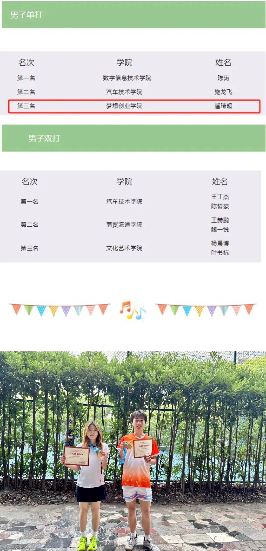 华体汇app全站版第九届网球比赛圆满落下帷幕,我院全体参赛队员奋力拼搏,取得女子双打第一、混合双打第一、女子单打第二、男子单打第三的佳绩。