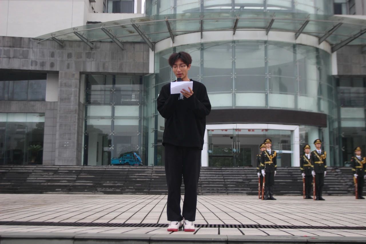 学生代表刘端阳同学发表“爱国主义,铸就梦想”的国旗下讲话。他倡导同学们要坚定理想信念,勇于担当责任。利用大学时间,努力学习新知识、掌握新技能,培养自己的创新思维和能力,以奋斗之我为祖国建设添砖加瓦。