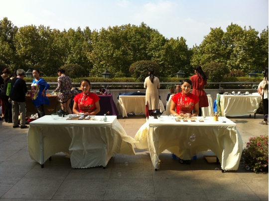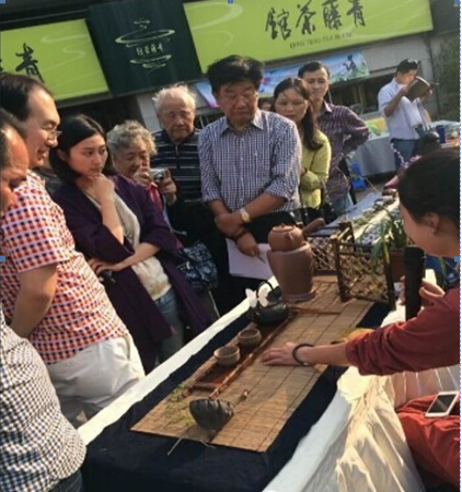 活动在青藤茶馆面临西湖的大露台举行,秋风送爽、丹桂飘香,如此适宜户外活动的好天气,聚集了极大的人气。此次活动内容非常丰富,有秀茶艺的,也有秀茶席设计的,还有小茶人秀杭州传统的“茶百戏”;参与的选手也是来自各个层面,有小学生、大学生、茶馆从业人员、茶爱好者、普通市民等等。我院工商行政管理专业的戴悦、谷粒同学参加了红茶茶艺的表演,其纯熟的冲泡技艺获得了评委与围观群众的称赞,我院酒店管理专业的魏俊兰、汪婧妍同学设计的精美的茶席获得了专家的一致好评。活动最后,几位杭州茶文化知名专家对选手的表演以及展示的茶席一一做了点评,参加此次活动的师生还与上城区茶研学会专家在青藤茶馆进行了交流。